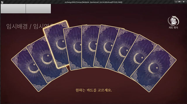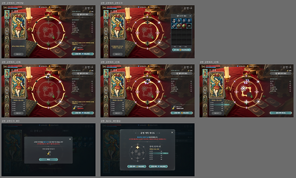 두번째는 운명 카드를 뽑는 연출 시안용으로 임시로 노드를 이어본 것입니다. 따라서 좌측 상단에 임시 버튼을 보실 수 있습니다. 이렇게 복잡한 연출이 필요한 경우에는 직접 연출을 이어봐서 괜찮은지 확인 후 구현에 전달하였습니다.